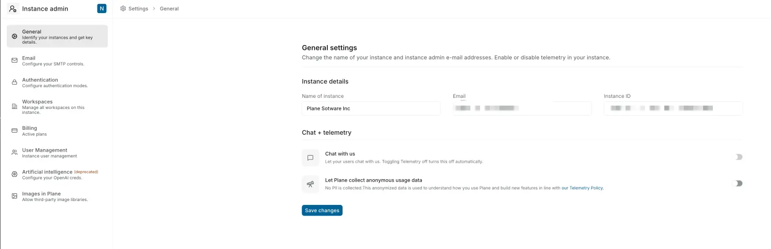 The General settings page allows you to view or configure core instance details and telemetry preferences. Here’s what you can manage: